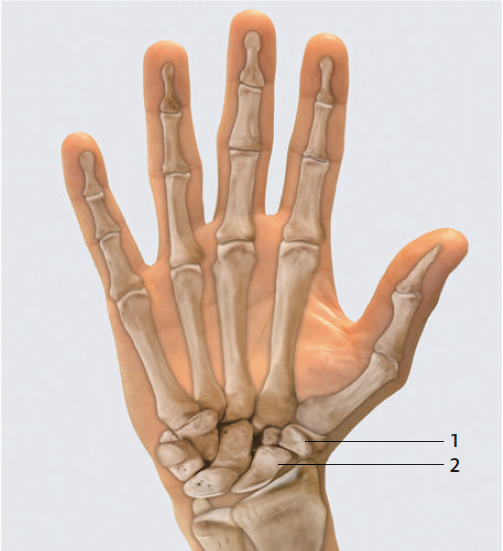 Рис. Между бугорками ладьевидной кости и кости-трапеции обычно около 1 см. Цифрой один отмечен бугорок трапеции, а под вторым номером бугорок ладьевидной кости.