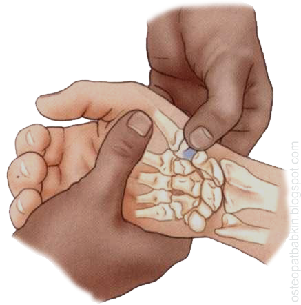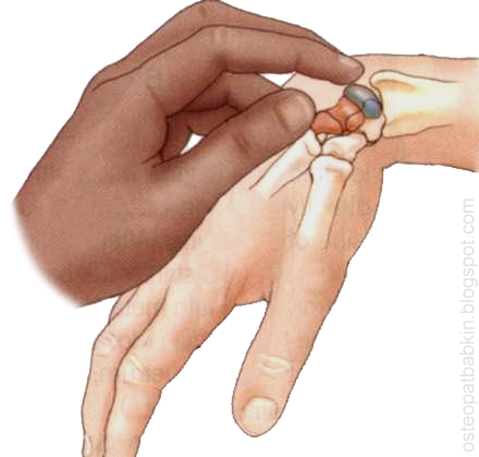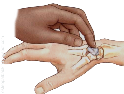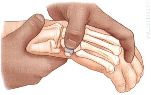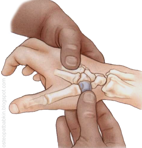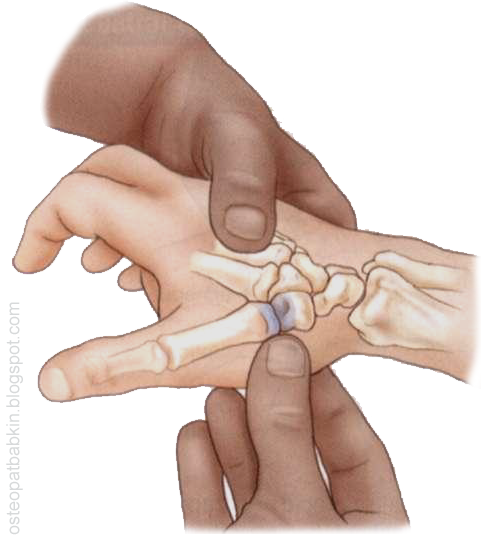 Рис. Пальпация запястно-пястного сустава большого пальца.Для пальпации сустава мы можем сначала найти ладьевидную кость, и следовать по её наружной поверхности дистально до соединения кости-трапеции с первой пястной костью. Иногда для пальпации удобен обратный вариант. Мы можем начать пальпацию с первой пястной кости и двигаться по ней проксимально до её "края", где и будет нужный нам сустав. Чтобы более точно определить запястно-пястный сустав большого пальца, мы можем попрасить пациента активно подвигать большим пальцем. При этом мы должны более четко ощутить движение пястной кости на кости-трапеции.