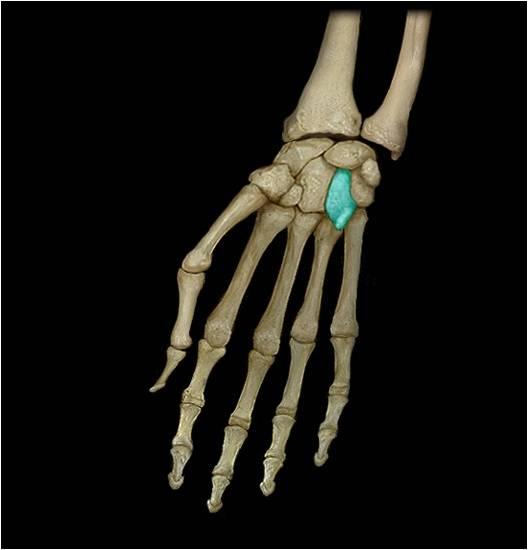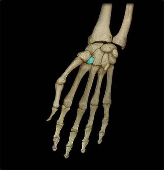 Рис. С бугорка основания четвертой пястной кости мы можем перейти проксимально на крючковидную кость.