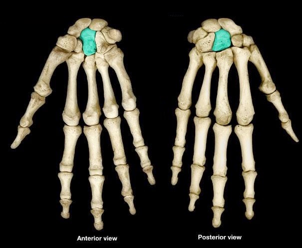 Рис. Полулунная кость (os lunatum) — кость проксимального ряда запястья.Полулунная кость лежит в проксимальном ряду запястья между ладьевидной и трёхгранной костями. Удобнее всего полулунную кость пальпировать на задней, или тыльной стороне кисти. Для этого нужно спуститься с головчатой кости в проксимальном направлении, немного отклоняясь в сторону локтевой кости.