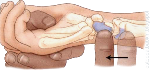 Область над полулунной костью будет ощущаться как углубление. После этого следует попрасить пациента совершать поочередно сгибание и разгибание в лучезапястном суставе. При сгибании полулунная кость будет "всплывать" в углублении под пальцем, а во время разгибания будет углубляться и "исчезать".