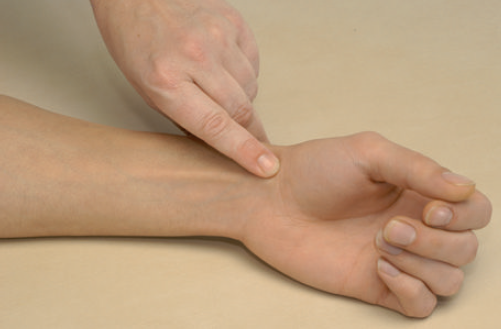 Рис. На фотографии показана пальпация бугорка кости трапеции, или tuberculum ossis trapezii.