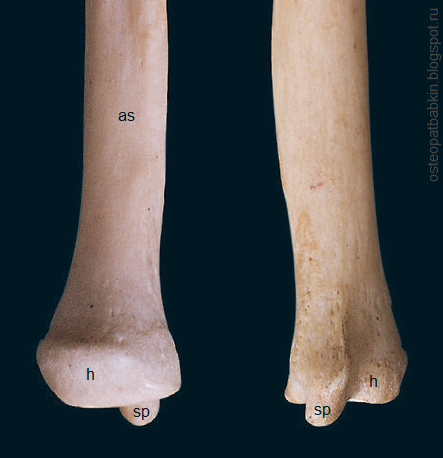 Рис. На левом рисунке нижняя часть локтевой кости спереди, на правом рисунке сзади: h—дистальный эпифиз, или головка локтевой кости (caput ulnae), sp—шиловидный отросток локтевой кости (styloideus ulnae), as—передняя поверхность локтевой кости.