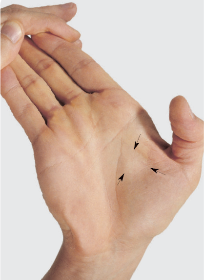 Бугорок кости-трапеции также может быть пропальпирован на ладонной (передней) поверхности запястья.