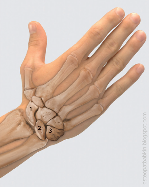 Рис. 1—ладьевидная кость, 2—полулунная кость, 3—трёхгранная кость.