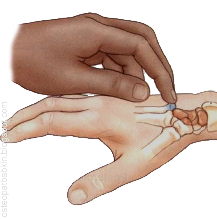 Для пальпации сначала стоит найти бугорок лучевой кости, как это было описано выше. От бугорка спускаемся дистально к основанию третьей пястной кости.